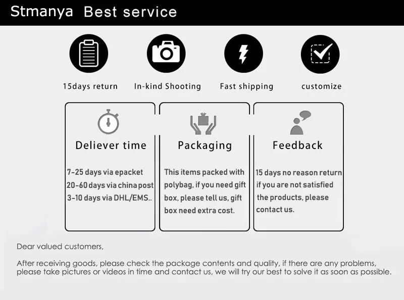 Se você quiserpara receber seu pacotemais rápido, e querorastreamentoinformações do pacote,Por favor escolha "epacket"ou"China Post Air Mail", prazo de entrega do “epacket”: 10-28 dias.