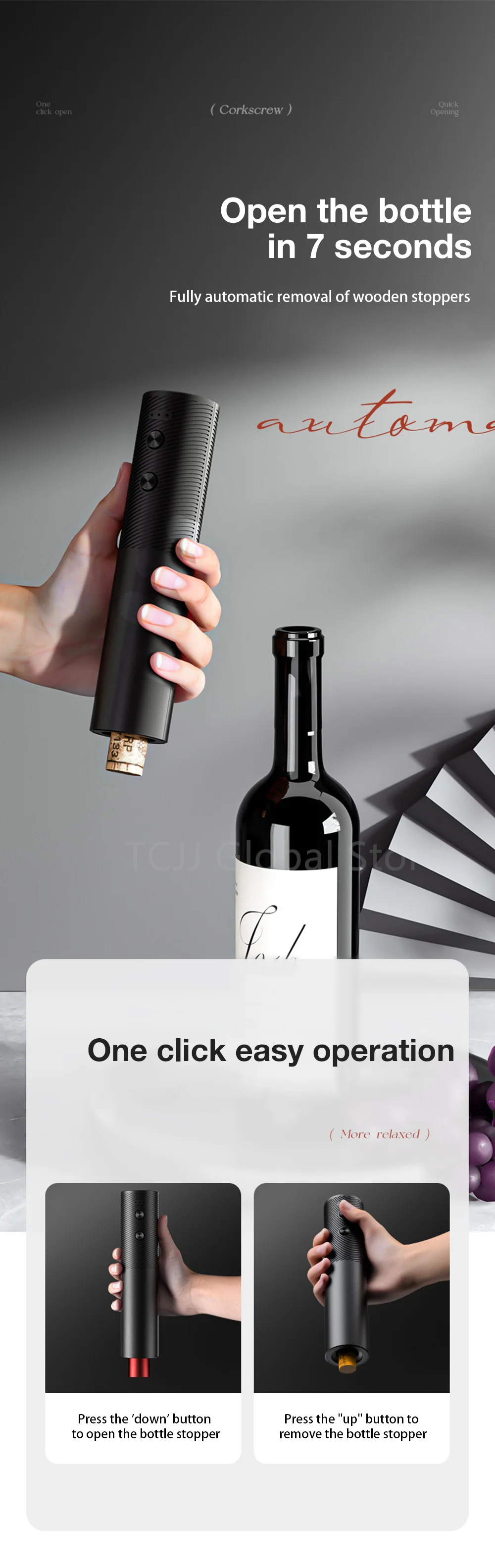 Este abridor de vinho elétrico é a escolha ideal para entusiastas do vinho, especialmente adequado para reuniões familiares, reuniões de amigos, banquetes de negócios e outras ocasiões. Tanto os degustadores de vinho profissionais quanto os consumidores comuns podem usá-lo facilmente e desfrutar da conveniência e diversão de abrir garrafas.
