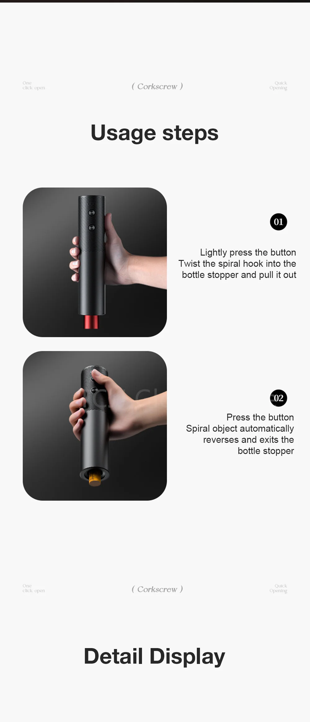 Detecção inteligente: Equipado com um dispositivo de detecção inteligente, pode identificar com precisão a posição da rolha da garrafa, garantindo um processo de abertura suave e desobstruído.
