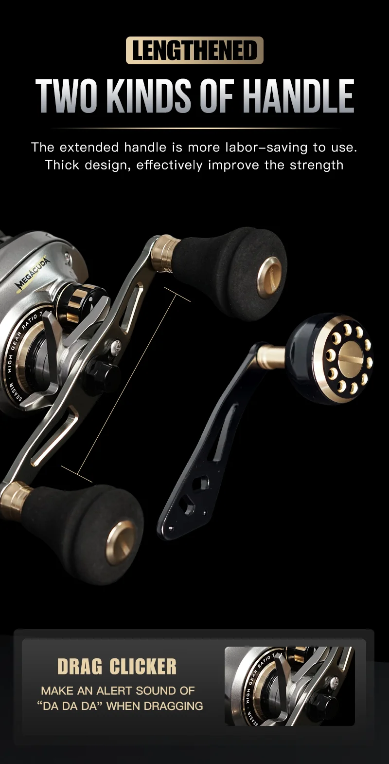 • Punho dobro:O punho duplo deste carretel fornece um aperto confortável e permite o controle fácil e preciso da linha.